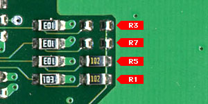 Configure the set of resistors labeled "R1, R3, R5, R7" which are underside of